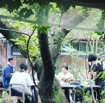 場所:ソーイングテーブルコーヒー裏庭の大きな木の下でのヨガとなります。