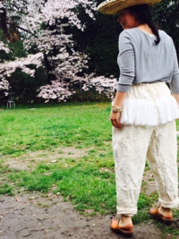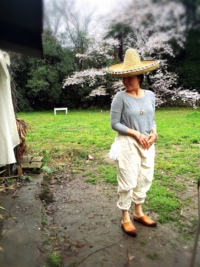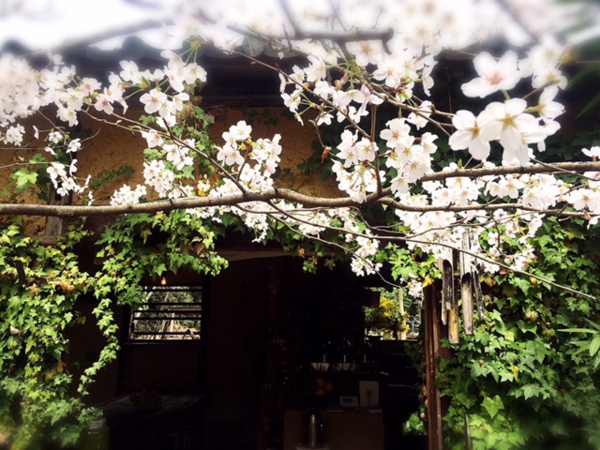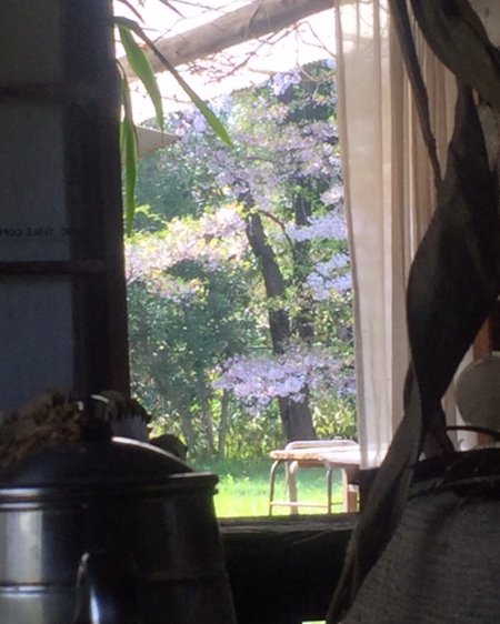 とぼけた会話を、今、花ひらこうとする桜の木の下で、言う。ソーイングテーブルの目の前の桜の木も何才になるのかな。
