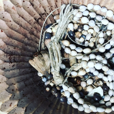 瓶には、じゅず玉のひと粒が細いラフィアで丁寧に結ばれていて、